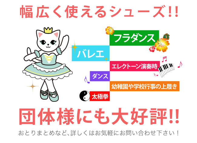 ●団体様にも大好評!!おとりまとめなど、詳しくはお問い合わせ下さい。バレエ、フラダンス、エレクトーン、ピアノ、吹奏楽、マーチング、太極拳など各種ダンスレッスンシューズの用途をはじめ、幼稚園や学校行事等での室内履きとしても。沢山の方にご愛用をいただいています。