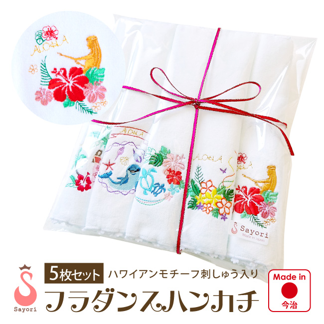★ALOHA!みんなが大好きなハワイのモチーフを刺しゅうにデザインしました。ハワイが好きな人、ハワイアン雑貨を集めている方などにもおすすめです♪他では買えない、サヨリがデザインしたオリジナル刺しゅう入りのタオルハンカチです♪★柄が選べる2枚セットです。届いてそのままお渡しできるように無料ラッピング付きです。名入れも可能(別途料金)。★ハンカチの周りには飾りレースが編み込まれていてとってもキュート。素材はふわふわで、肌触りの良い綿100%を使用。安心の日本製・有名な愛媛県の今治タオルを使用しています。毎日使う物だから、素材にこだわりました。★団体様におすすめ!発表会のプレゼント用のご注文を沢山いただいております!