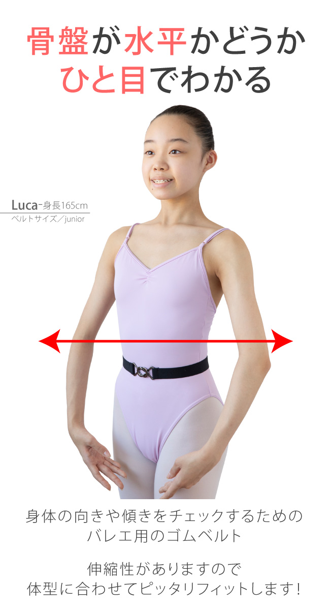 【カラー】ホワイト/ブラック 【サイズ】kids/junior/free ●骨盤が水平かどうかひと目でわかる!身体の向きや傾きをチェックするためのバレエ用のゴムベルト ●伸縮性があり、なめらかな肌触りのゴムを使用しているので、体型に合わせてピッタリフィット ●脱着簡単な金具