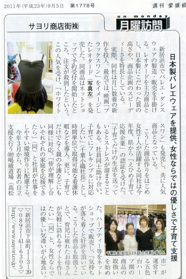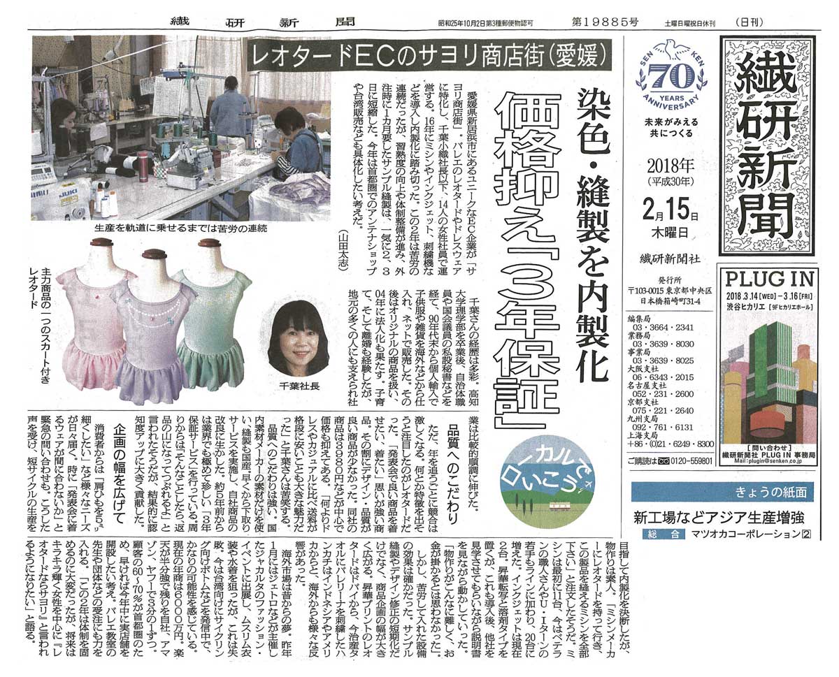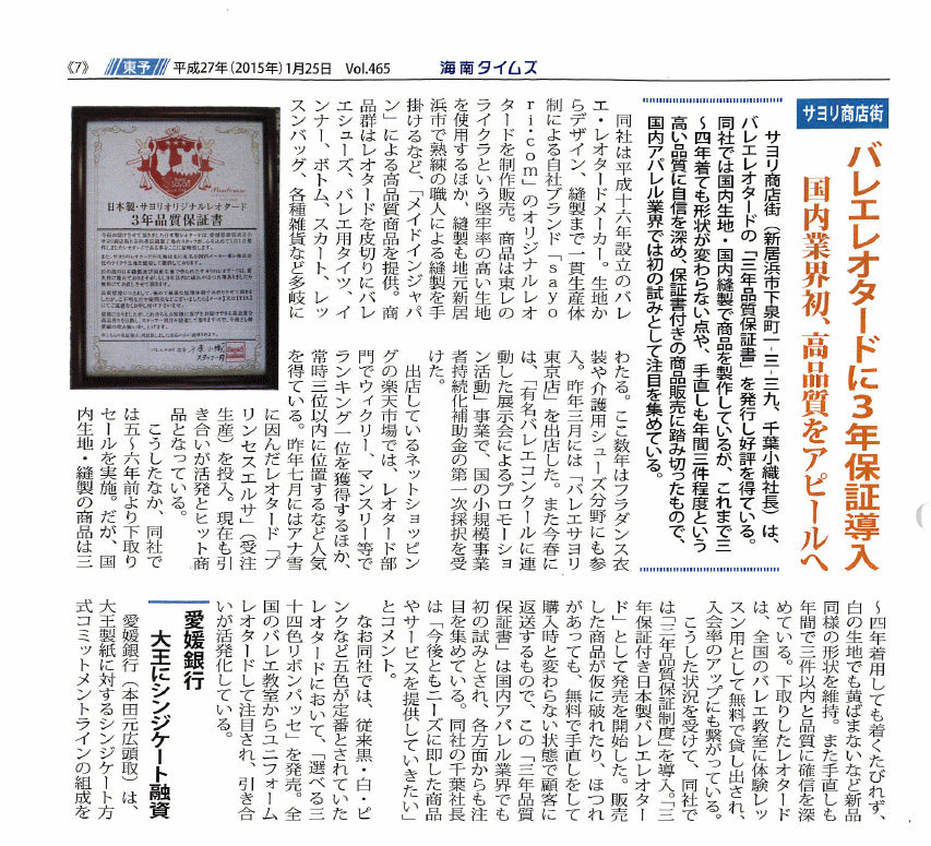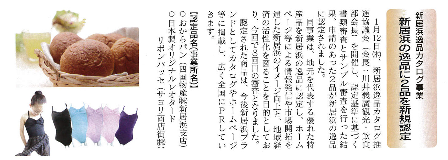 >>リボンパッセレオタードが【新居浜の逸品】に認定されました(新居浜商工会議所・会報「niihama」2月号に紹介記事が掲載)
