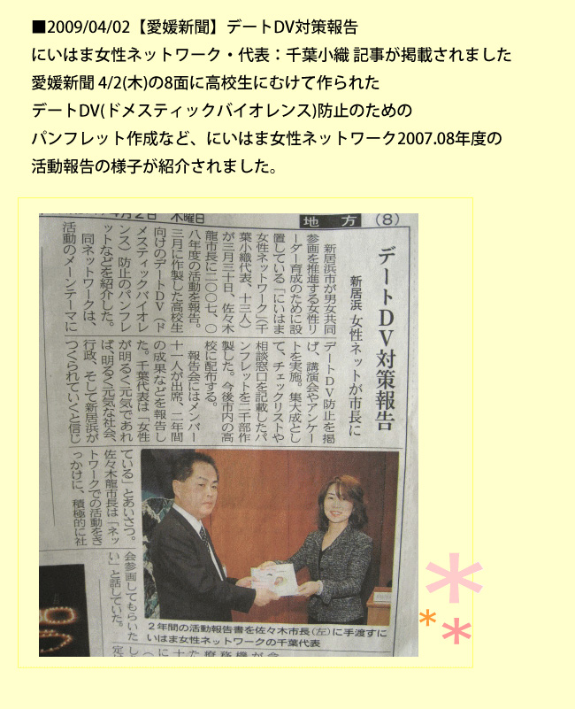 >>【愛媛新聞】【デートDV対策報告】(にいはま女性ネットワーク・代表:千葉小織)記事が掲載されました
