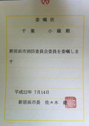 >>新居浜市消防委員会委員・委嘱(代表・千葉小織)