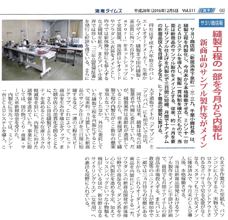 >>海南タイムズ 2016年2月5日号 縫製工程の一部内製化の事例が紹介されました