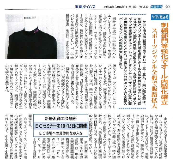 >>海南タイムズ 2016年11月15日号 [縫製工程の刺しゅう部門等強化でオール内製化確立] 記事が掲載されました